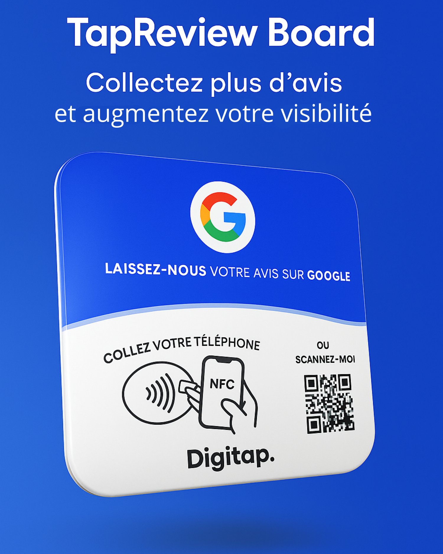La TapReview Board™ transforme cela en retour instantané. Plus d’avis = plus de visibilité et plus de clients. Agissez maintenant et prenez une longueur d’avance sur vos concurrents.